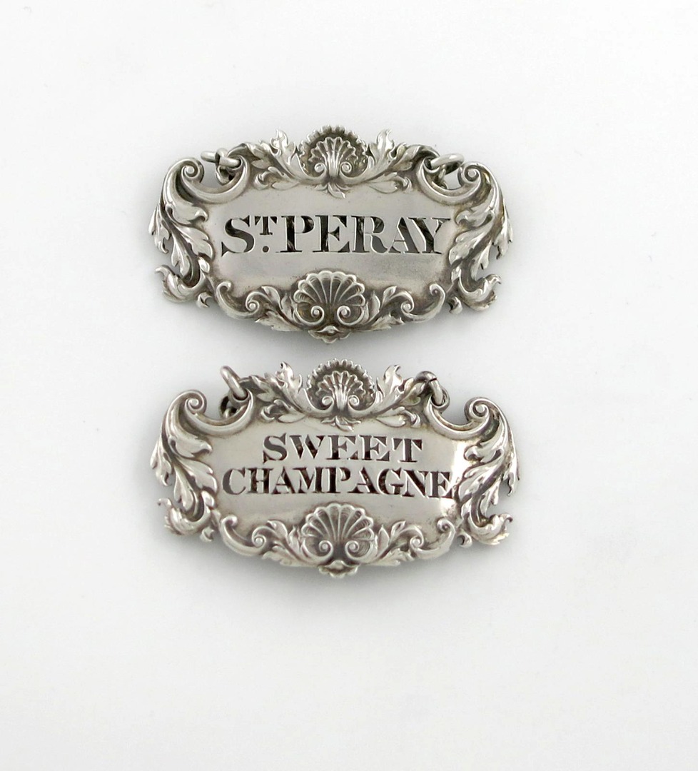 shaped cartouche form, embossed with foliate scroll and shell decoration, pierced 'ST. PERAY', and 'SWEET CHAMPAGNE', length 6cm, approx. weight 1.2oz. (2)