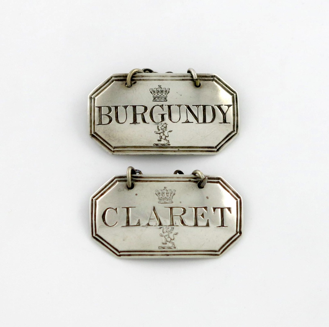 rectangular form, canted corners, reeded borders, engraved with a coronet and a crest, and incised 'BURGUNDY' and 'CLARET', length 4cm, approx. weight 0.6oz. (2)