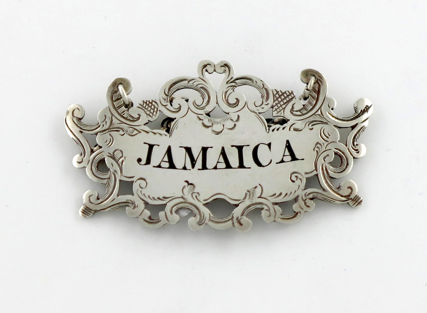 pierced and engraved cartouche form, incised and blackened 'JAMAICA', length 6cm, approx. weight 0.4oz.