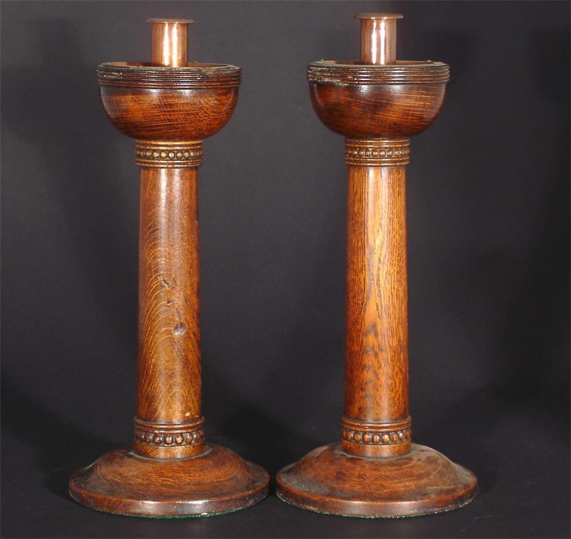A pair of turned oak and copper candlesticks on domed base unmarked 34cm. high
