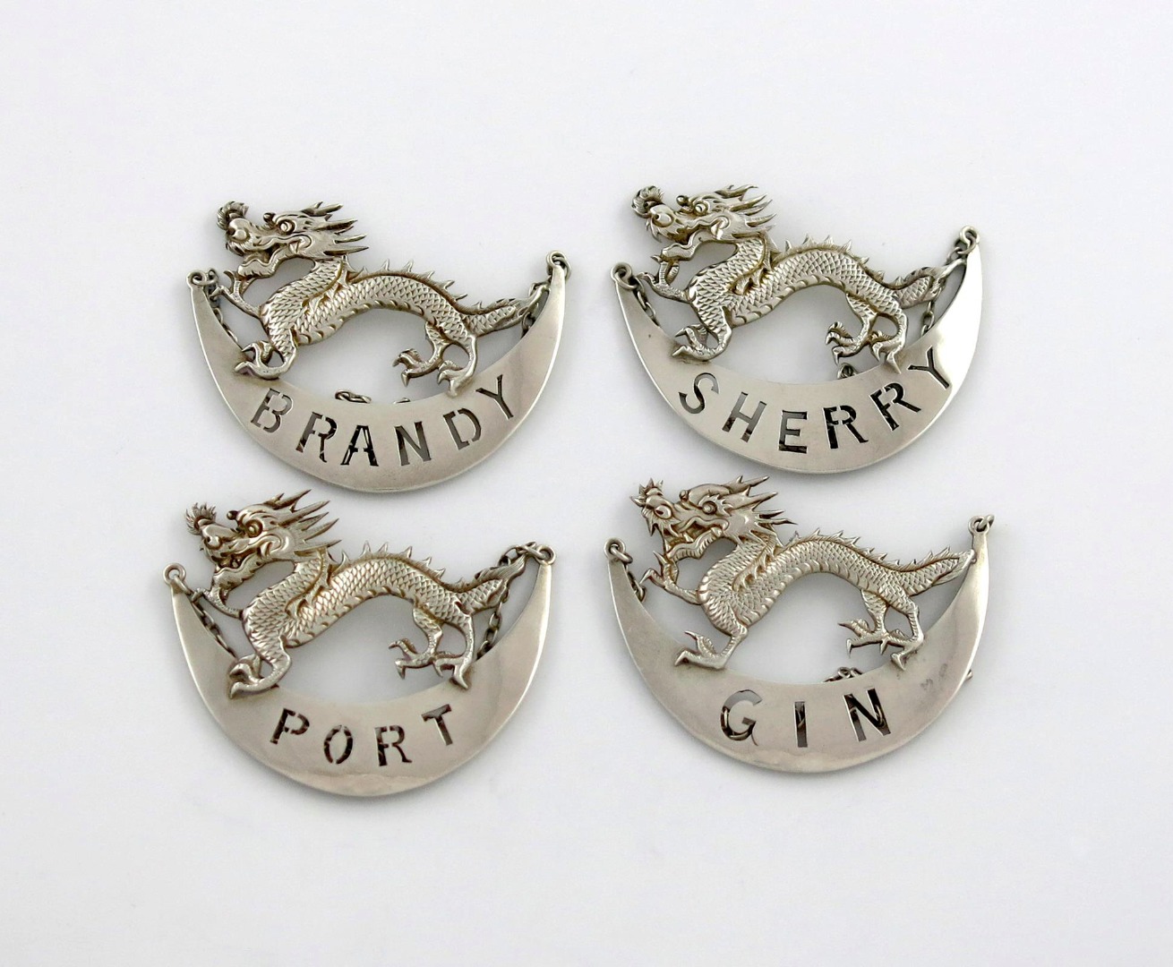crescent form, mounted with a dragon, pierced 'PORT', 'SHERRY', 'BRANDY' and 'GIN', length 6cm, approx. weight 1.5oz. (4)