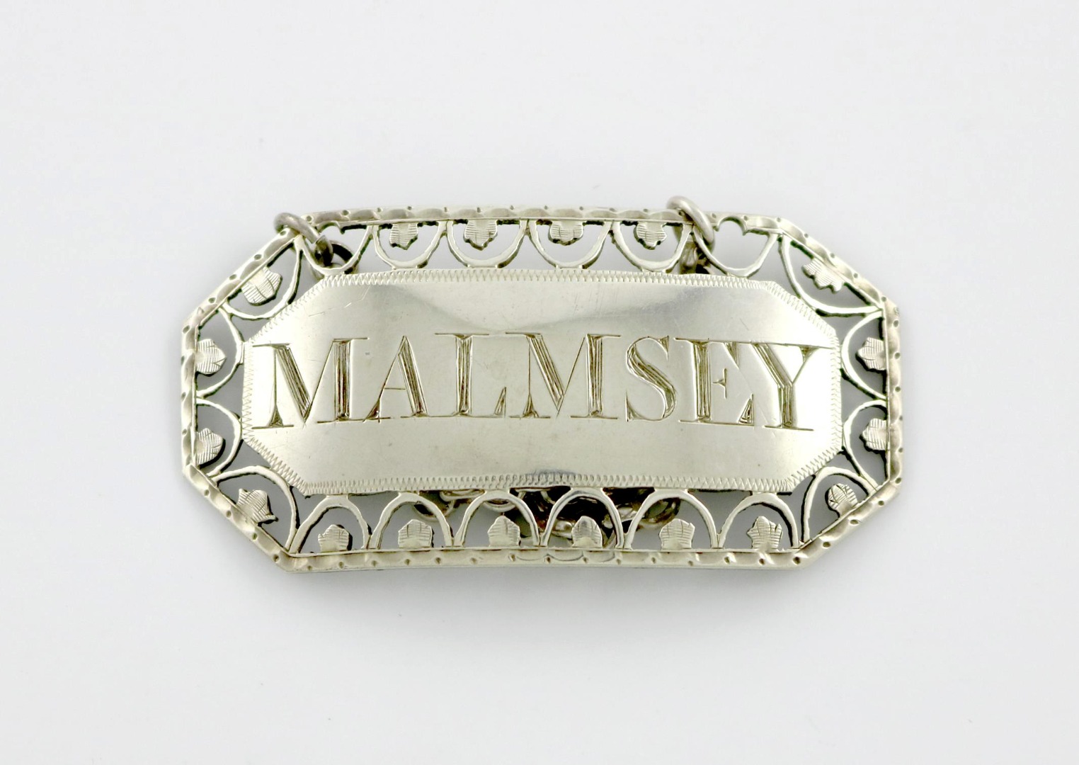 rectangular form, canted corners, pierced and bright-cut foliate border, incised 'MALMSEY ', length 4.8cm, approx. weight 0.3oz.