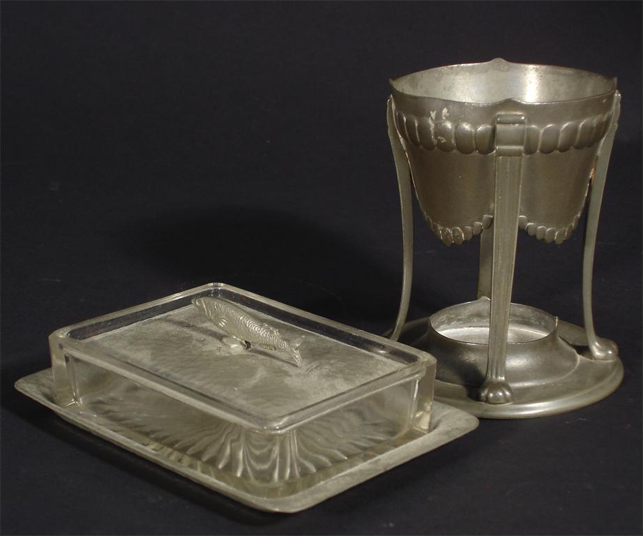 A Unity pewter and glass sardine dish, cover and tray surmounted with sardine finial, and a Liberty English Pewter vase base stamped marks, Liberty piece missing liner 15.5cm wide