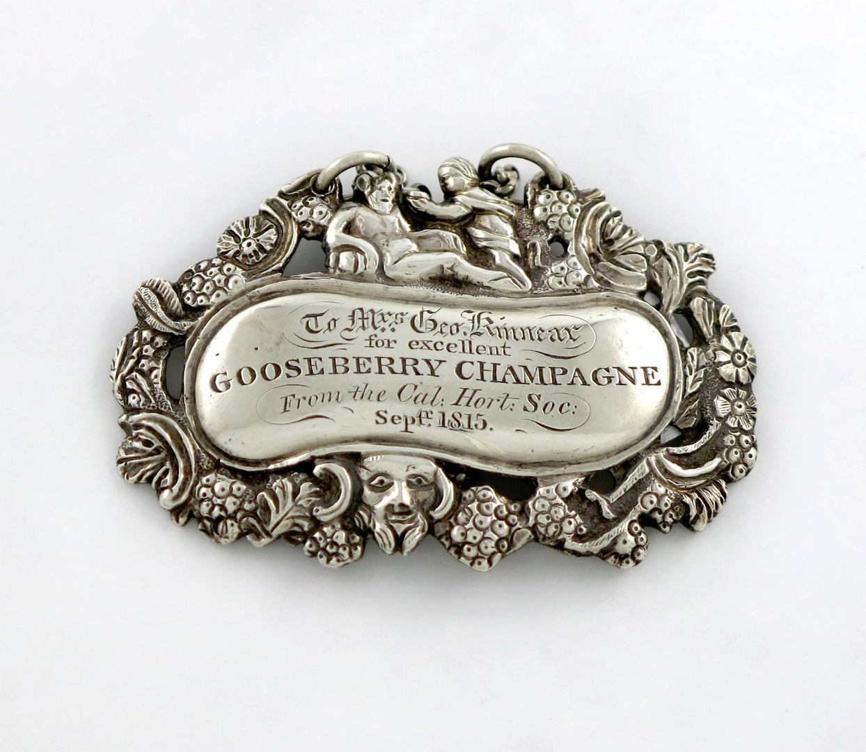 shaped oval form, with Bacchus and a cherub, pierced vine and scroll border, inscribed 'To Mrs. Geo. Kinnear for excellent GOOSEBERRY CHAMPAGNE, from the Cal: Hort: Soc:, Sept 1815', length 7.8cm, approx. weight 1.6oz.