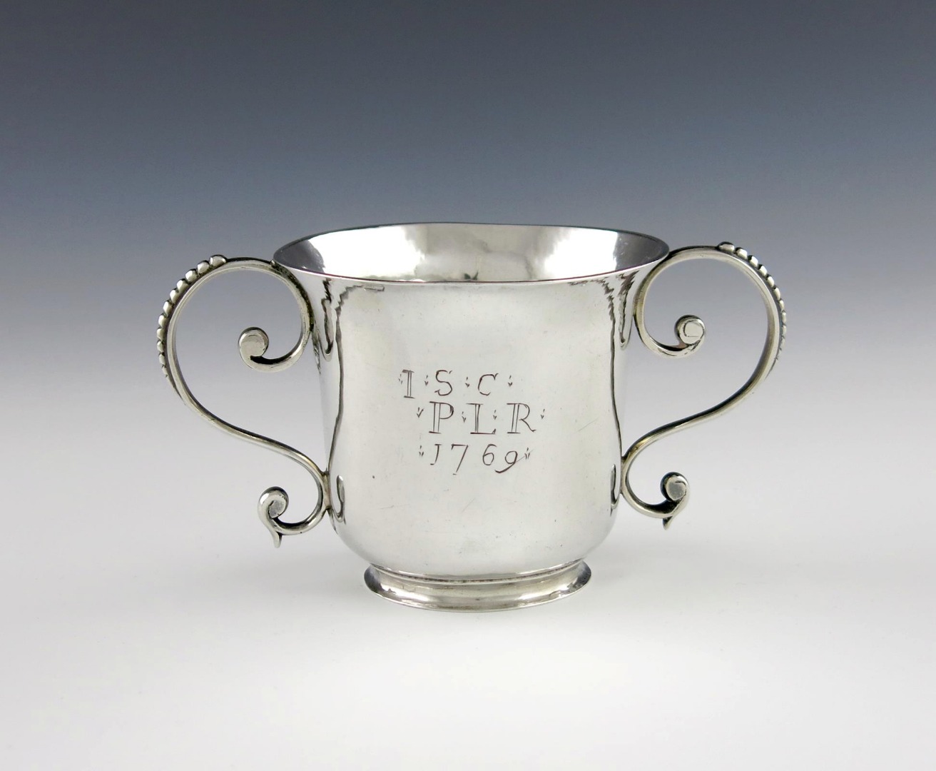 circular form, beaded scroll handles, engraved 'I.S.C' over 'P.L.R' '1769', height 7.3cm, approx. weight 3.8oz.