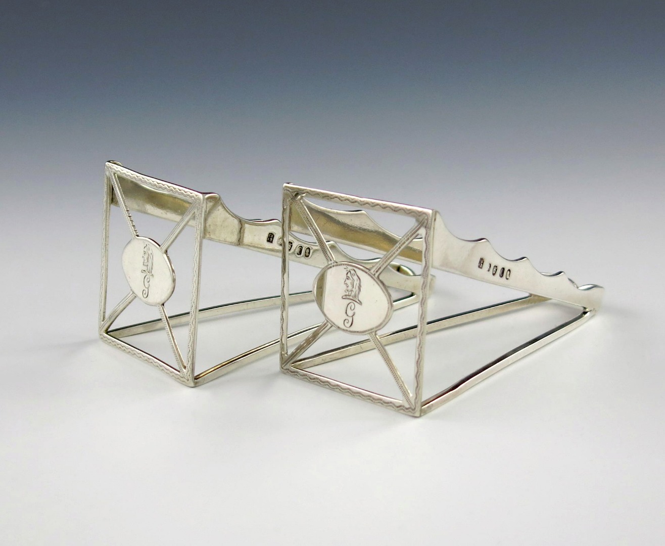 tapering rectangular wedge form, wavy-edge border, engraved decoration, engraved with a crest and initial, length 10cm, approx. weight 3.4oz. (2)