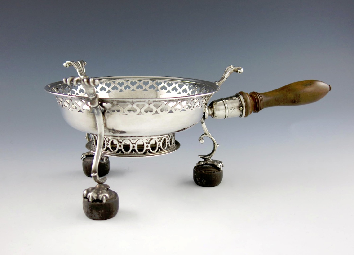 circular form, turned wooden baluster handle, pierced scroll border, with three scroll supports, on three scroll legs with claw feet and on bun bases, with a detachable heater base, the underside inscribed 'The gift of Mrs Jud. Whitaker HRB', length 29.5cm, approx. weight 18.2oz.