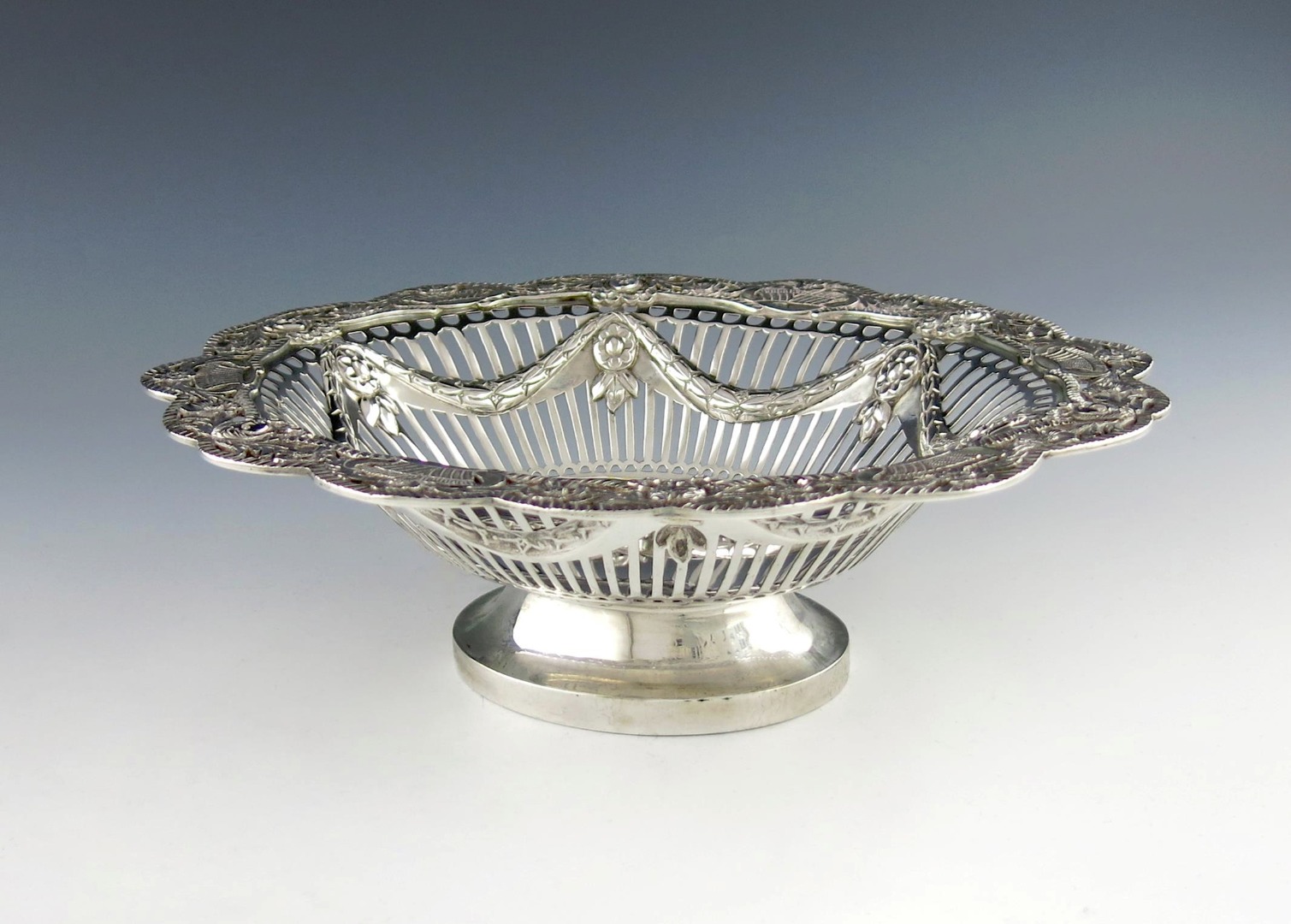 shaped oval bowl, pierced with slats and embossed with medallions and swags, pierced foliate border, on a raised oval foot, length 26.5cm, approx. weight 20.5oz.