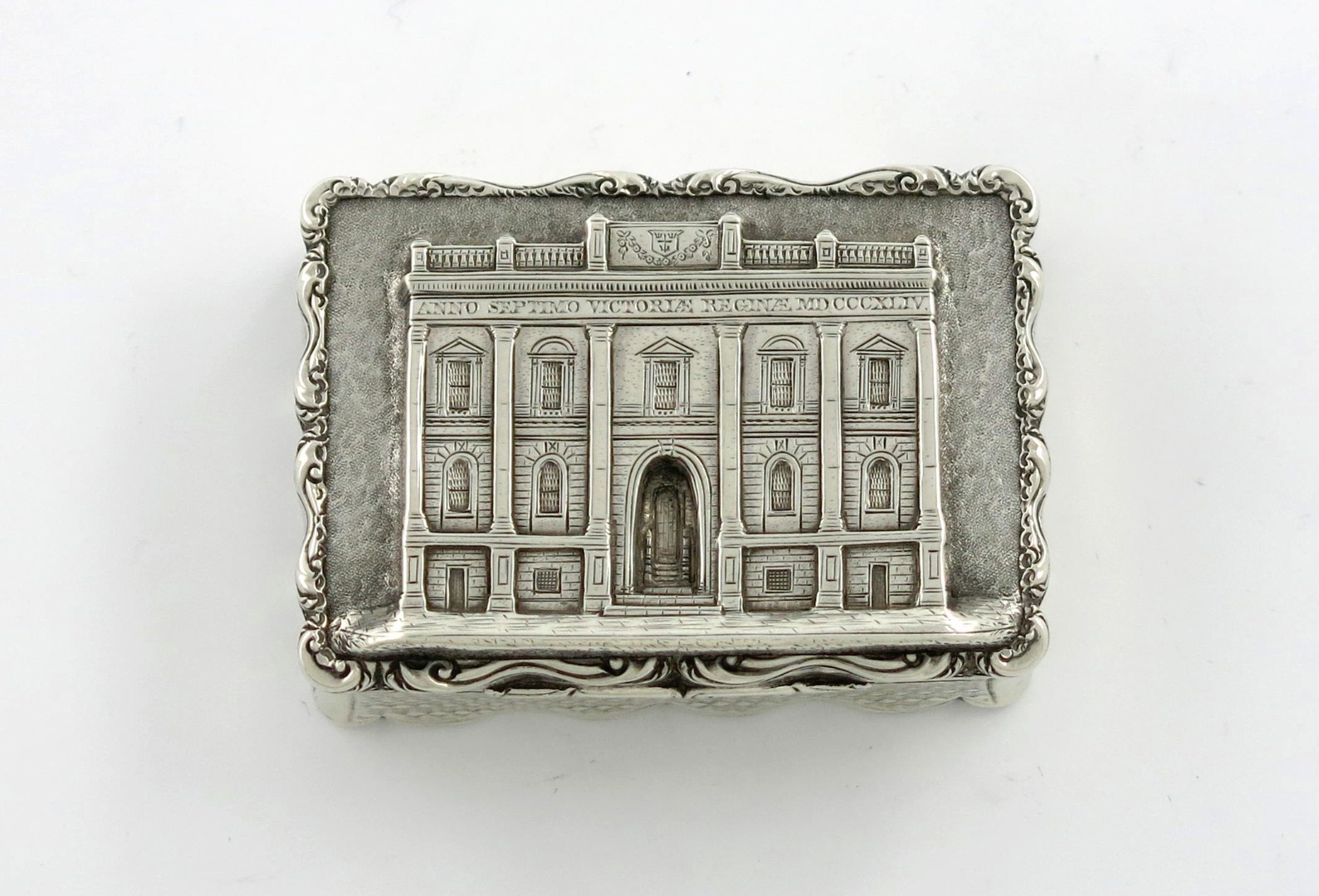 A rare Victorian silver 'castle-top' snuff box, Old Colchester Town Hall,