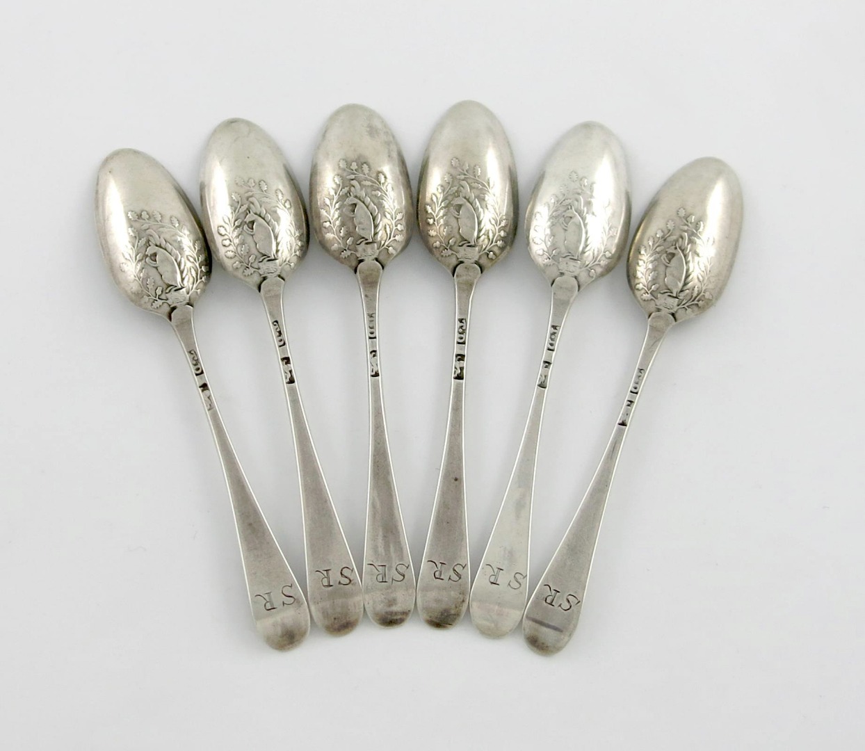 A set of six George III silver 'picture-back' Hanoverian pattern teaspoons