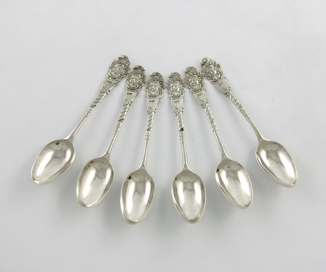 the terminals with a rococo male mask, also marked with a French import mark, approx. weight 2.7oz. (6)