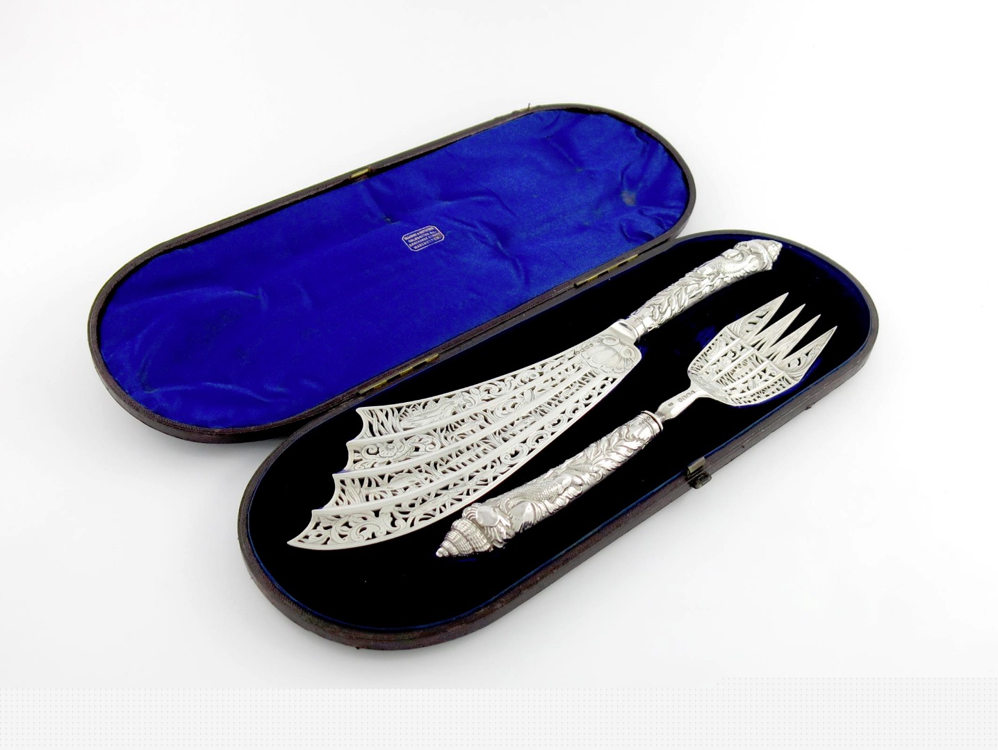 the scimitar shaped blade pierced and engraved with various fish amongst reeds, the handles with fish and shells, in a fitted case, length of knife 36.5cm.