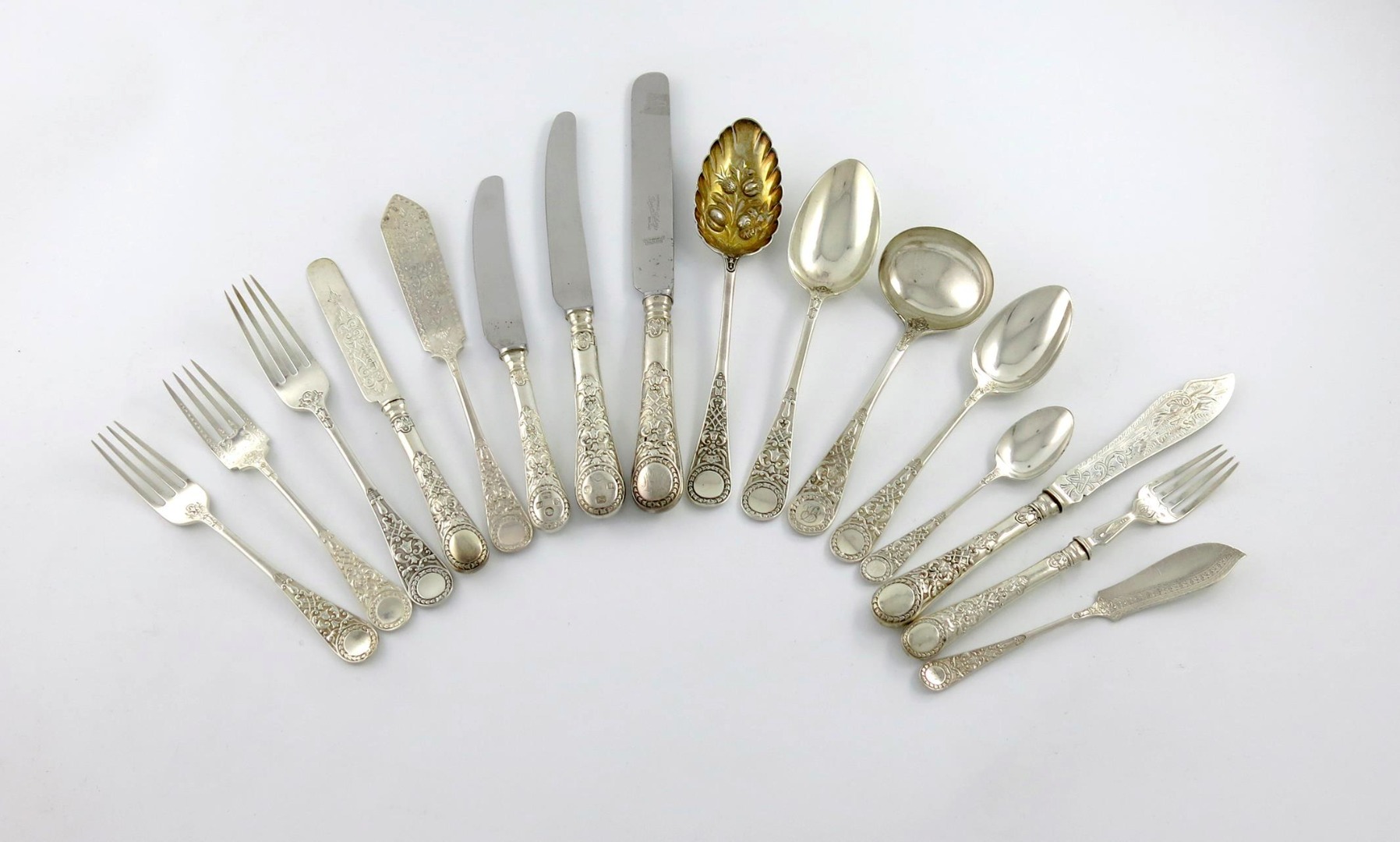 some with crests and initials, comprising: twelve table forks, twelve tablespoons, six dessert forks, six dessert spoons, six fish knives, six fish forks, twelve teaspoons, a cased pair of grape scissors, a pair of berry spoons, a sauce ladle, a pair of butter knives, a cased set of eleven teaspoons, tongs and caddy spoon, a cased set of six teaspoons and tongs, six fruit knives and forks, (filled handles), six fish knives and forks, (filled handles), six table knives, plus twelve modern table knives and twelve dessert knives, by Arthur Holder, approx. weighable 135oz. (qty)