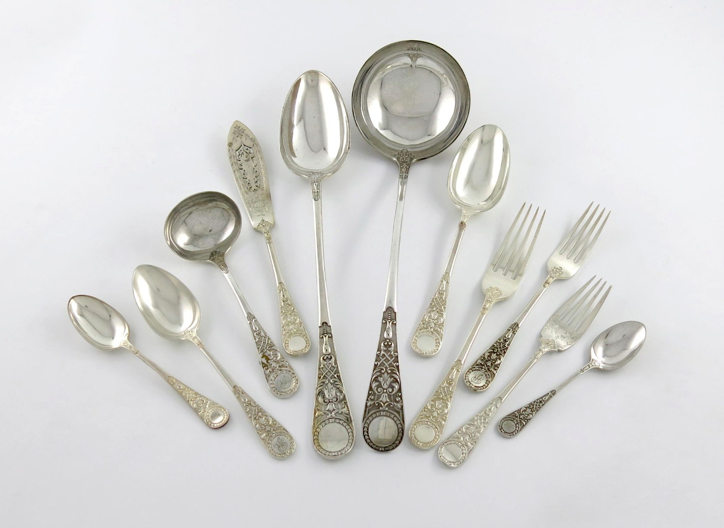 some crested, comprising: twenty table forks, twenty dessert forks, twenty dessert spoons, twelve tablespoons, eighteen teaspoons, three soup ladles, three basting spoons, a sauce ladle, six fish forks, and six fish knives. (qty)