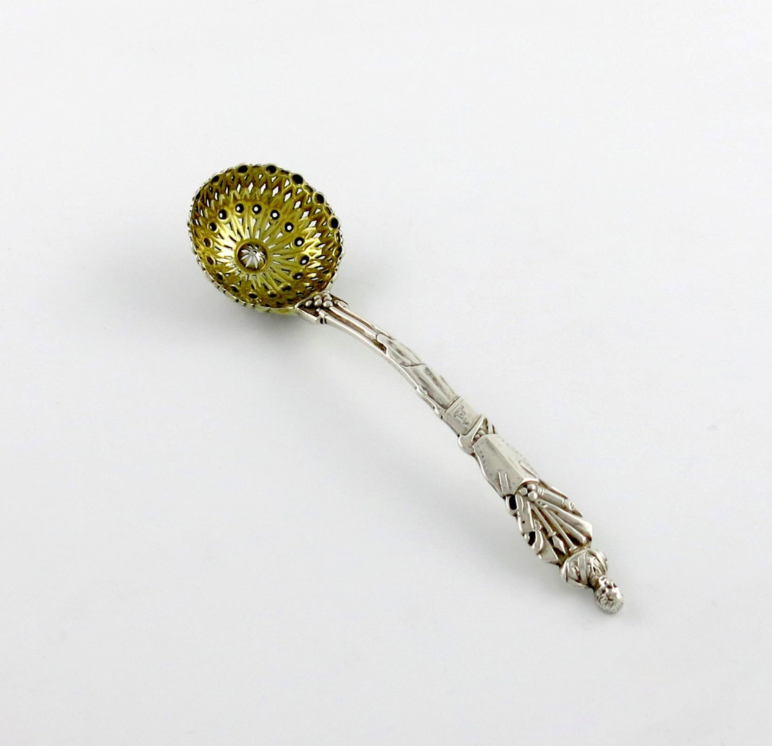 the handle with military arms and a bust of The Duke of Wellington, the gilded bowl with pierced foliate decoration, engraved with a crest, length 16cm, approx. weight 1.4oz.