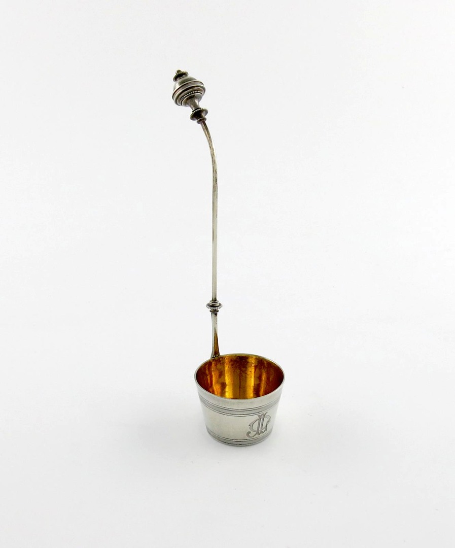 tapering tub shaped bowl, the handle with a baluster handle and beaded borders, gilded interior of bowl, initialled, length 18.5cm, approx. weight 1.4oz.