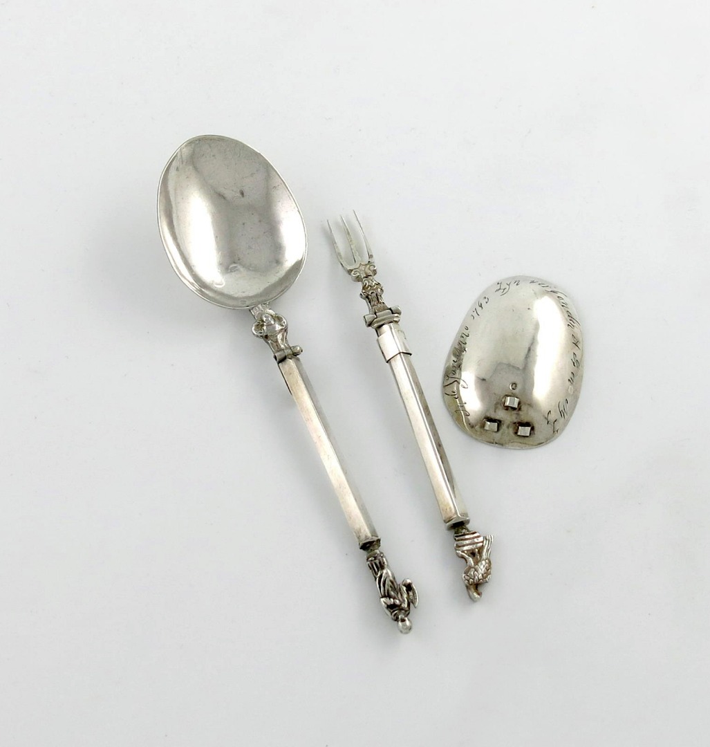 tapering square handle, with a bird finial, the pull-off bowl reveals the three tines of the fork, inscribed to bowl, plus another similar spoon, with an apostle finial, length 19.5cm and 19.3cm, approx. weight 3.9oz. (2)