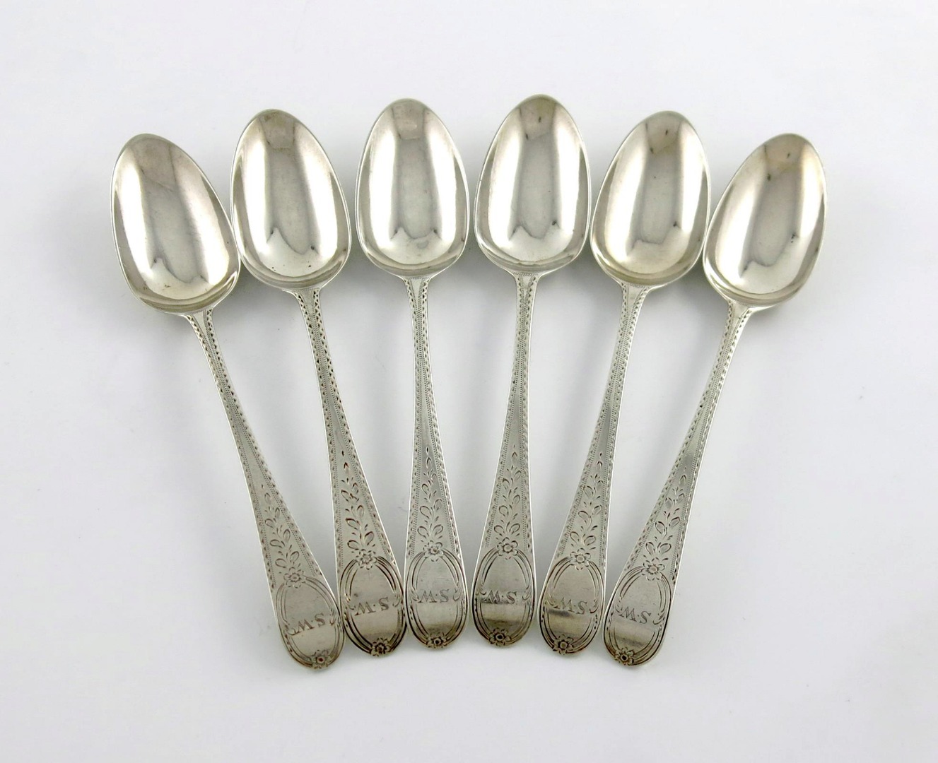A rare set of six George III silver Duty Draw-back Bright-cut dessert spoons