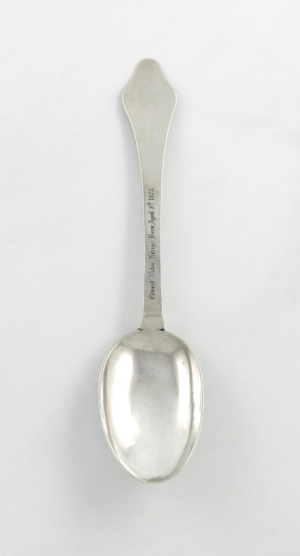 the oval bowl with a beaded rat-tail, the reverse of the elongated dog-nose finial prick-dot initialled 'GM' over 'ID' and dated '1711', the front of the stem later inscribed 'Edward Victor Harris, Born April 8th,1875', length 21cm, approx. weight 1.6oz.
