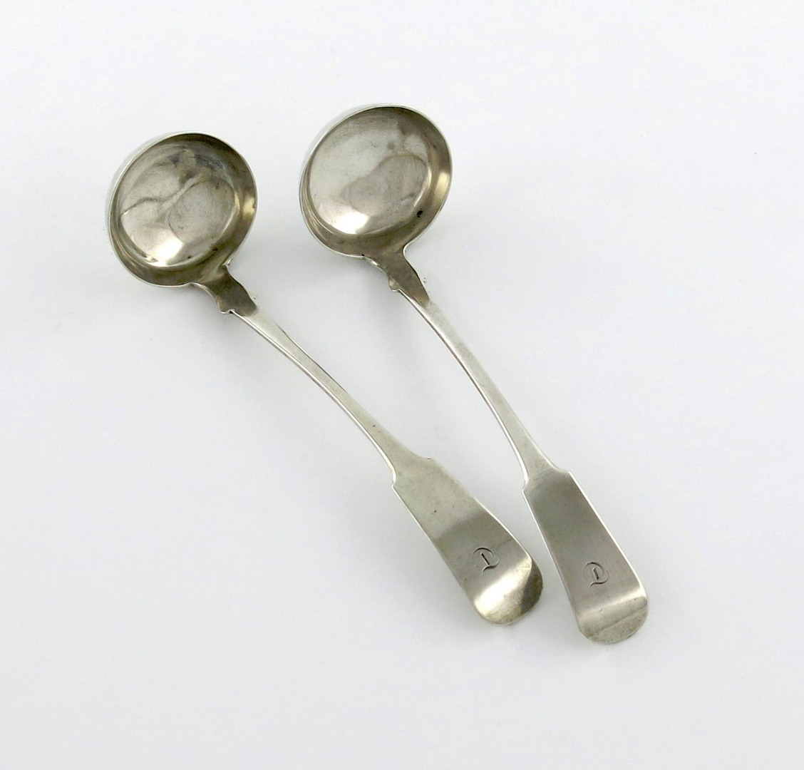 A pair of early 19th century Scottish provincial silver Fiddle toddy ladles