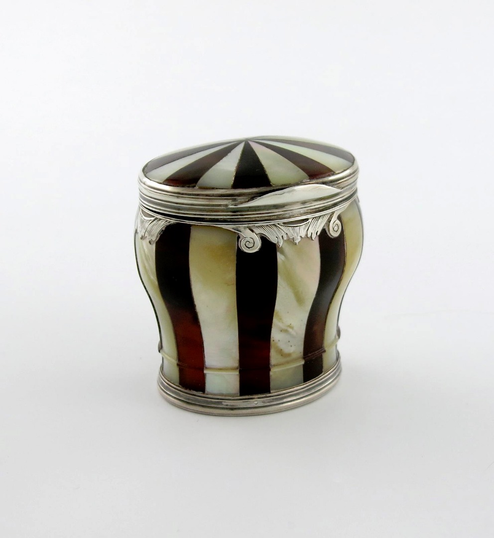 λA mid-18th century Scottish silver-mounted tortoiseshell and mother-of-pearl snuff mull