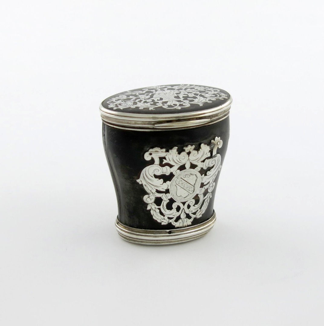waisted tapering oval form, the front and back with an inlaid foliate scroll cage-work cartouche, engraved with an armorial, the hinged cover inlaid with birds and foliate scroll decoration, height 5cm.