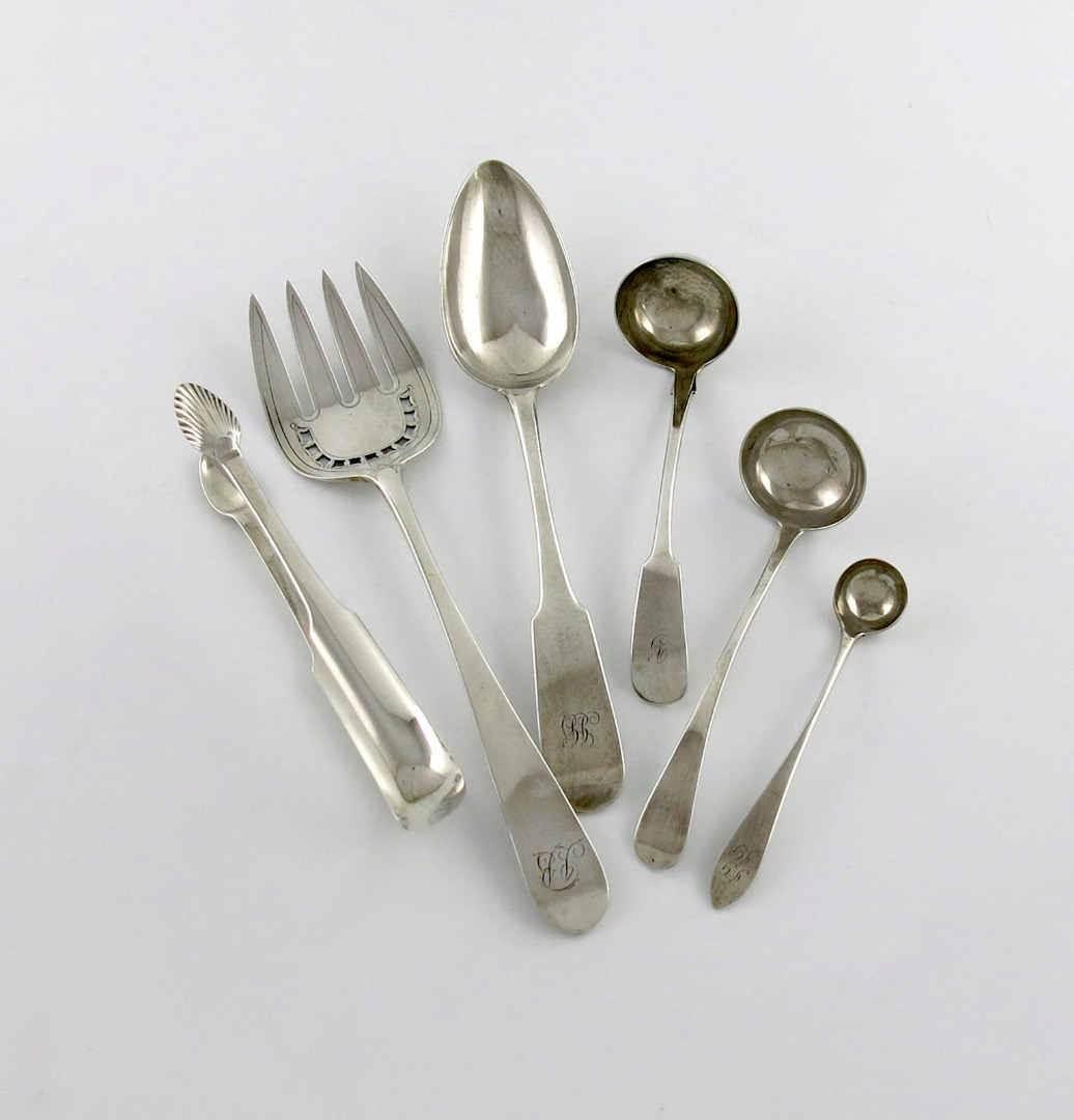 comprising: a toddy ladle, probably by William Kermath, Dundee circa 1830, plus an Old English pattern toddy ladle, by Alexander Cameron of Dundee, a Celtic-point condiment ladle by John Heron of Greenock, plus a pair of sugar tongs, an unascribed spoon and a converted fish fork, approx. weight 8oz. (6)