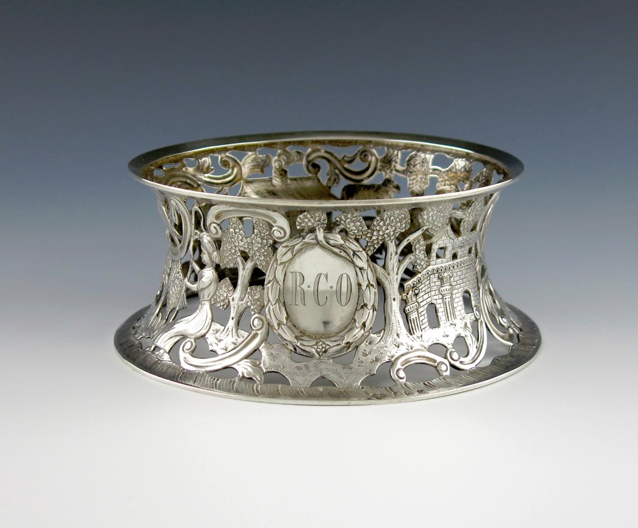 circular form, pierced and embossed with animals, people, buildings and foliate scroll decoration, initialled, diameter of base 17.5cm, approx. weight 7.5oz.