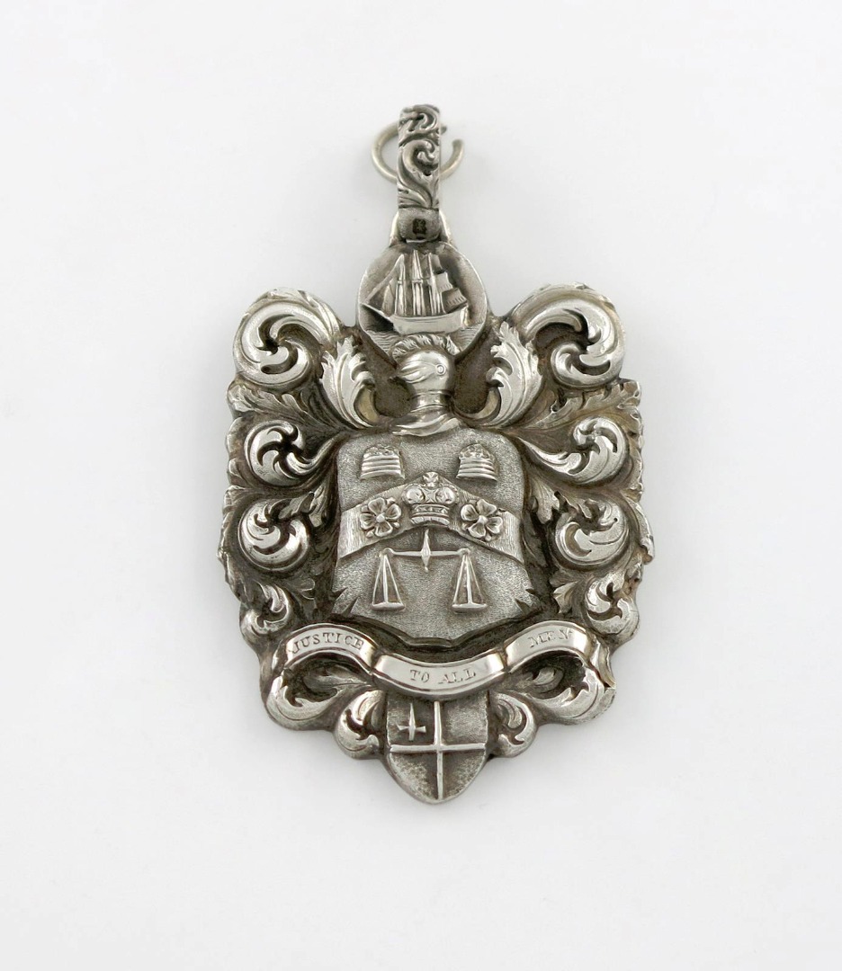 shaped form, foliate scroll decoration, with an armorial, the reverse inscribed 'James Jacks Deputy Sea Coal Meter, elected 20th Feb 1824', with a ring attachment, length 8.2cm, approx. weight 1.6oz.