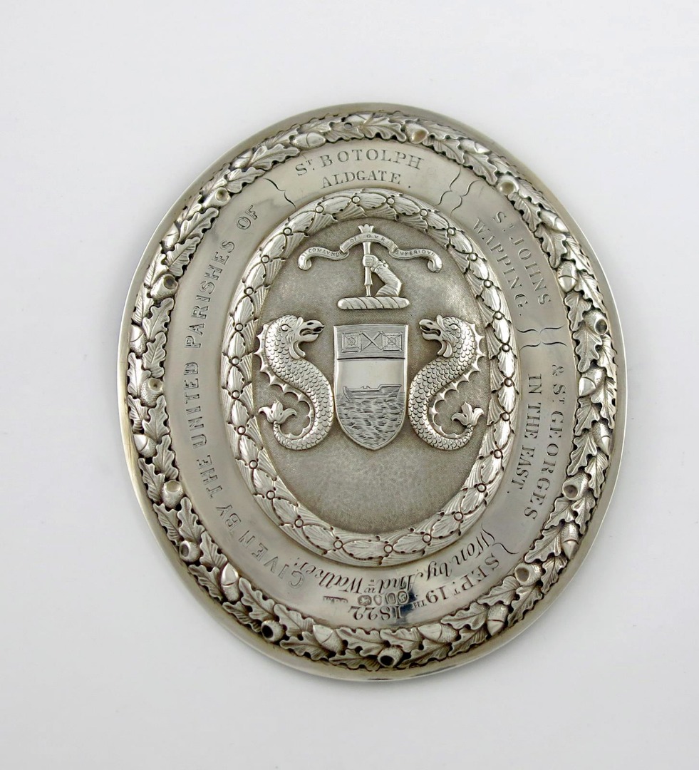 oval form, with chased oak leaf and acorn border, the centre chased with the crest and arms of the Company of Watermen and Lightermen on a matt ground, within a leaf and berry border, inscribed 'Given by the United Parishes of St. Botolph Aldgate, St. John's Wapping & St. George's in the East. Sept. 19th. 1822, Won by Andw. Walker', the reverse with one ring attachment, length 17.4 cm, approx. weight 4.9oz.