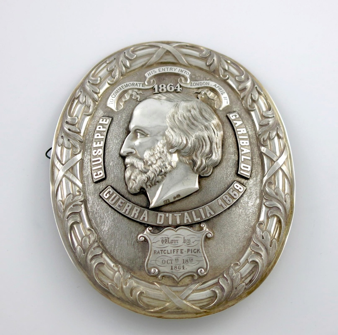 oval form, foliate ribbon and reed border, applied with a portrait bust of Giuseppe Garibaldi and dated '1864' also applied 'GIUSEPPE GARIBALDI GUERRA D'ITALIA 1859, TO COMMEMORATE HIS ENTRY INTO LONDON, APRIL 11TH.', on a matted background, with a cartouche inscribed 'Won by RATCLIFFE-PICK, Oct.er 18th. 1864', the reverse with three ring attachments, length 18.4 cm, approx. weight 6.9oz.