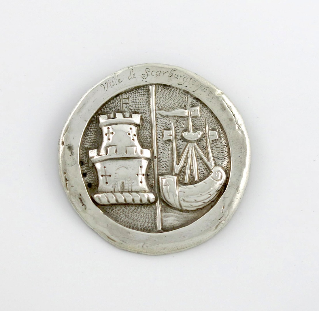circular form, embossed with a representation of the seal of Scarborough, divided vertically in two, a tower on the left, a lymphad on the right, inscribed 'Ville de Scarburgte (sic)1688', the reverse with two ring attachments, diameter 8.5oz, approx. weight 1.3oz.
