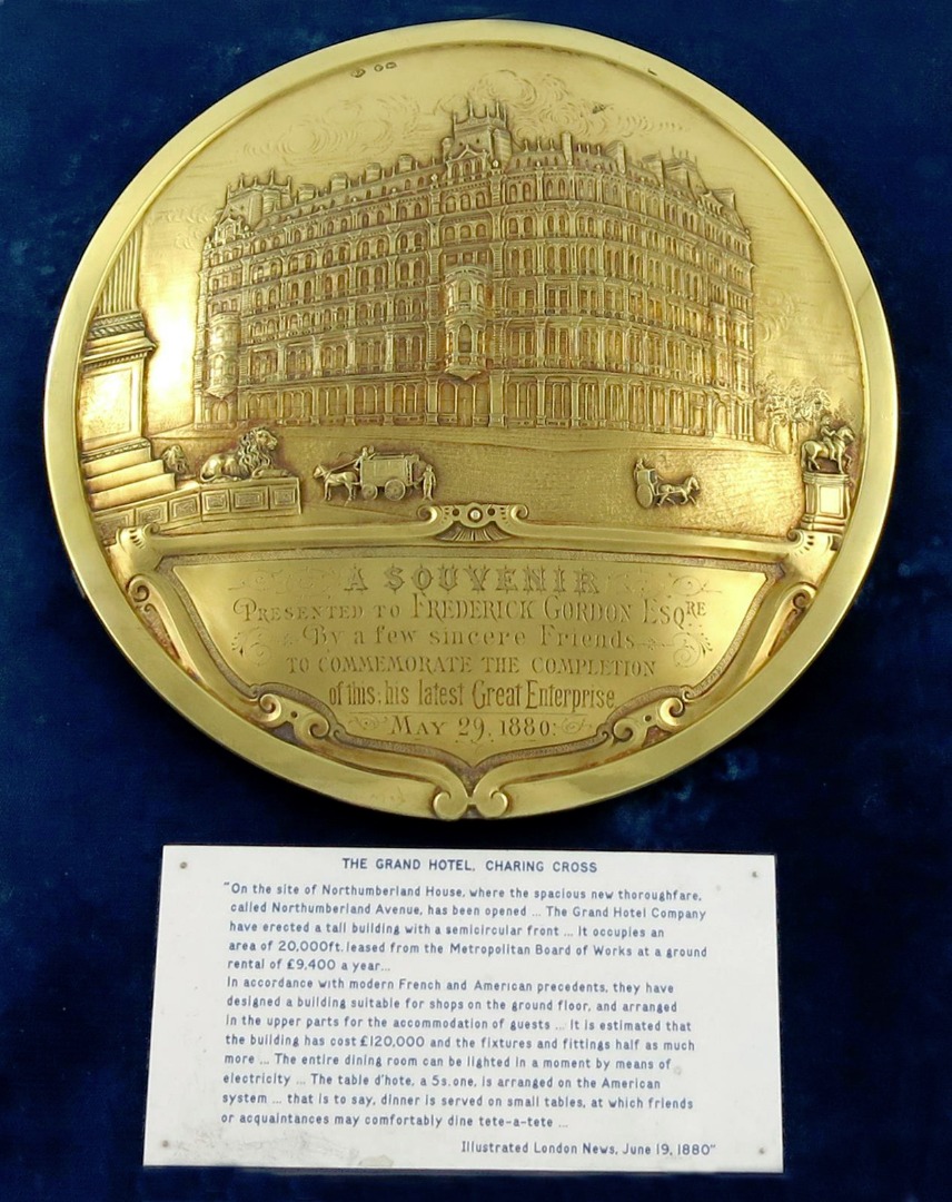 chased with a view of the Grand Hotel, Charing Cross, with the base of Nelson's Column to left and the statue of Charles I at Charing Cross to right, a carriage and hansom cab in foreground, inscribed 'A Souvenir presented to Frederick Gordon Esq.re by a few sincere friends to commemorate the completion of this; his latest Great Enterprise, May 29, 1880', mounted on a later blue velvet backed easel mount, diameter 24cm.