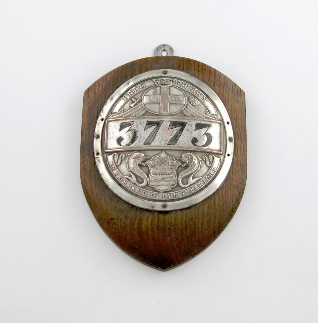 circular form, with the arms of the City of London and the Watermans' Company, numbered '3773' and stamped 'FREE WATERMAN, AT COMMAND OF OUR SUPERIORS', mounted on a wooden plaque, the reverse of plaque inscribed 1803-1837, total length 18cm.