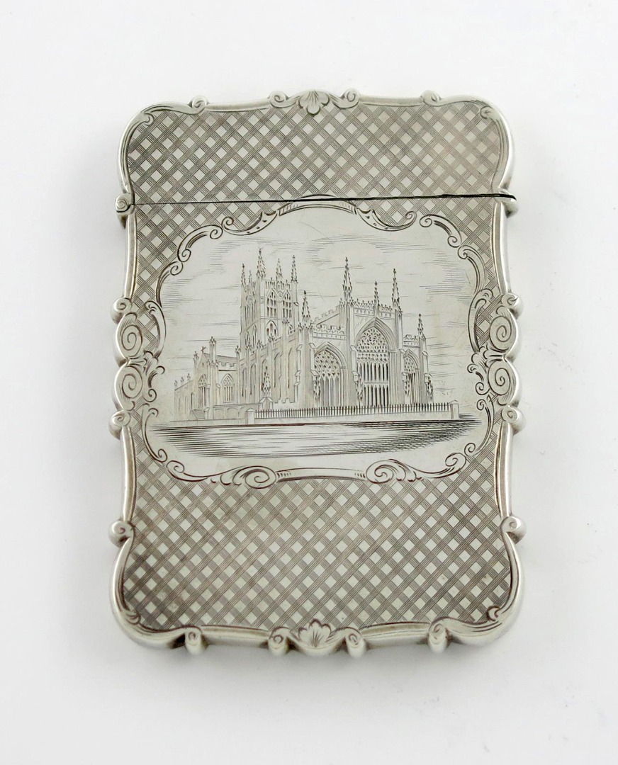 A Victorian silver engraved 'castle-top' card case, Holy Trinity Church, Hull,