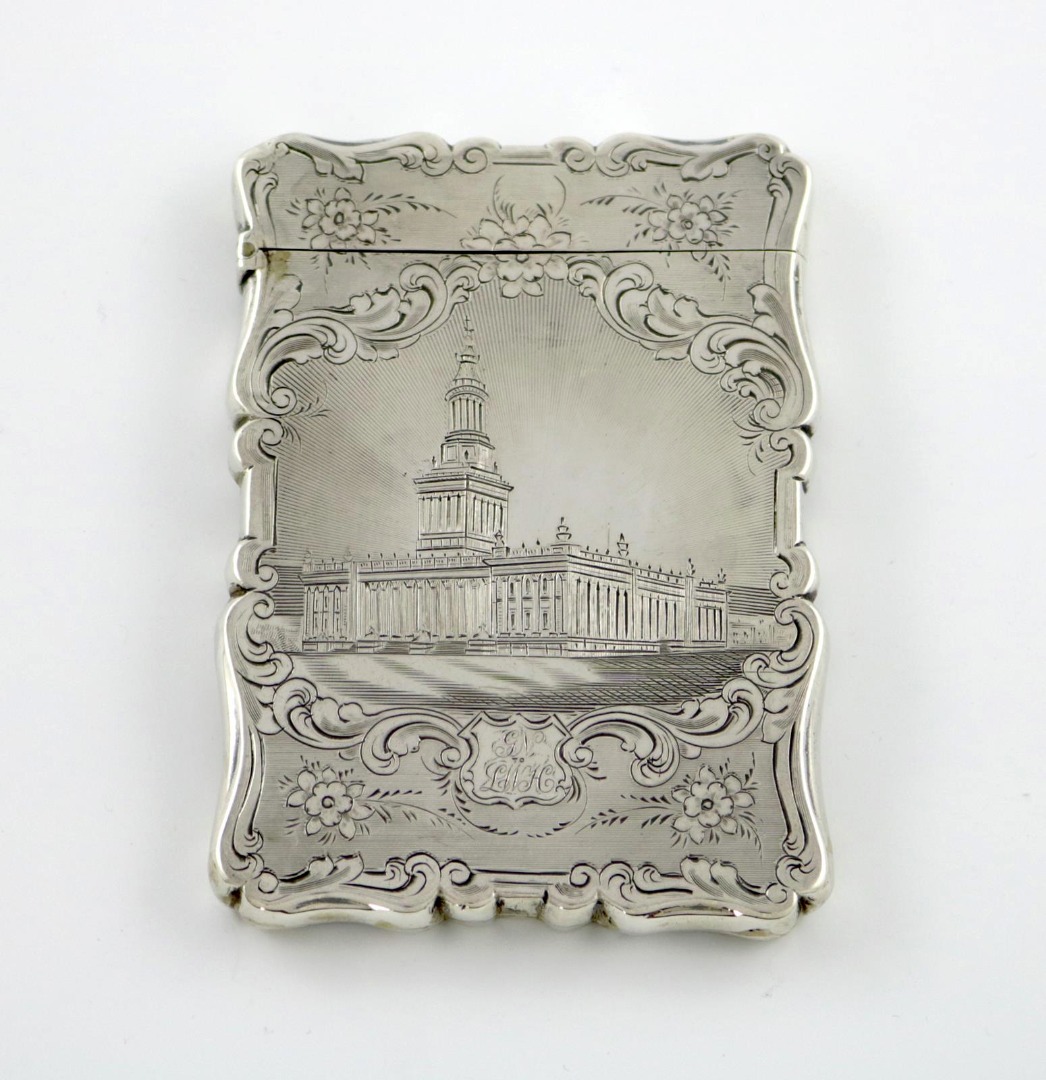 A Victorian silver engraved 'castle-top' card case, Leeds Town Hall,