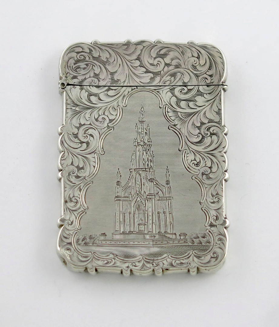 A Victorian silver engraved 'castle-top' card case, Scott Memorial,