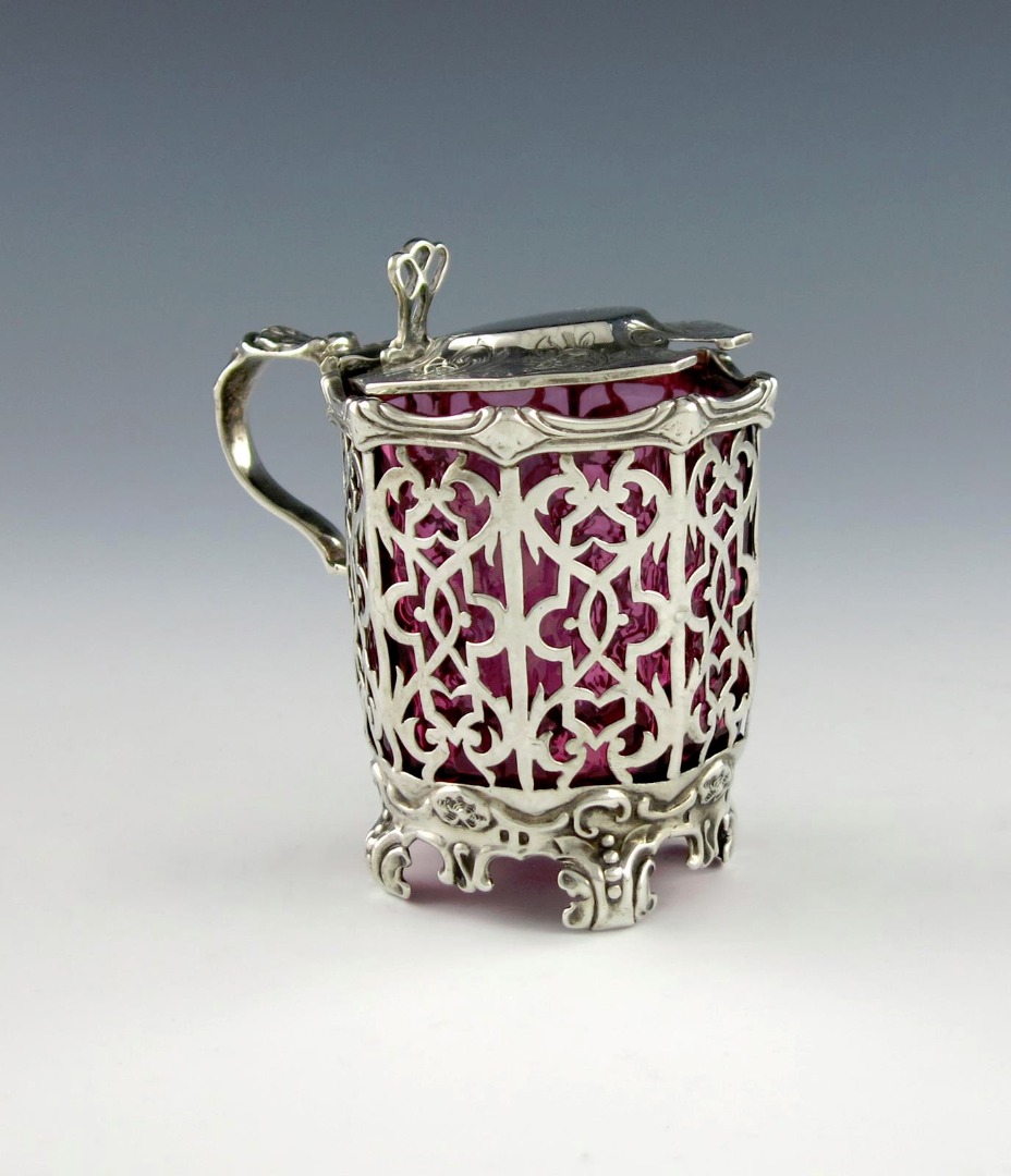 octagonal form, pierced decoration, the hinged cover with engraved decoration and with a pierced thumb-piece, on four scroll bracket feet, with a red glass liner, height 9.5cm, approx. weight 3.8oz.