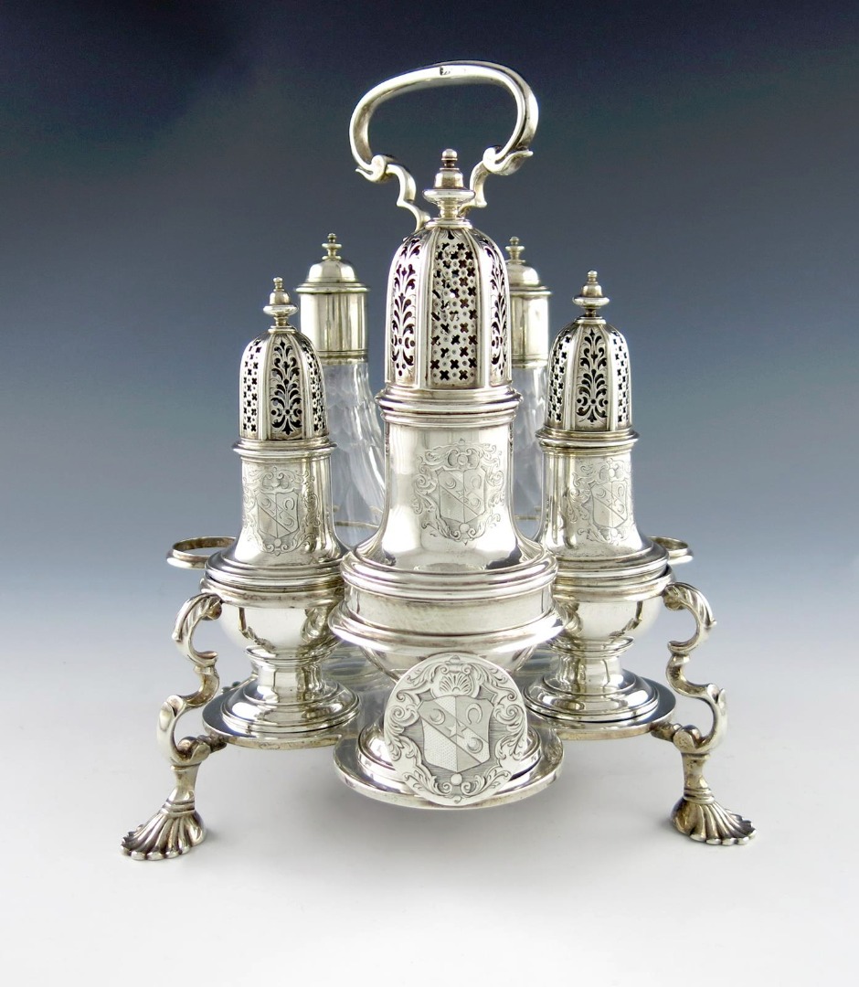 A George II silver Warwick cruet frame