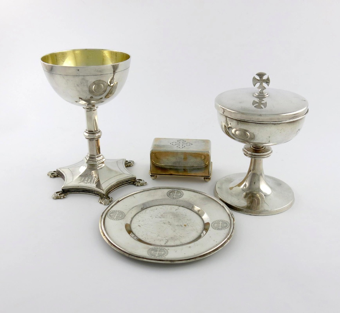 plain circular bowl, knopped hexagonal stem, on a raised hexagonal stem on six stylised feet, inscribed, with a Victorian paten, by John Figg, London 1874, plus a silver chalice, with an electroplated cover, by F. Osborne, London 1935, circular form, and a silver-gilt wafer box, in a wooden case, approx. weighable 28oz. (4)