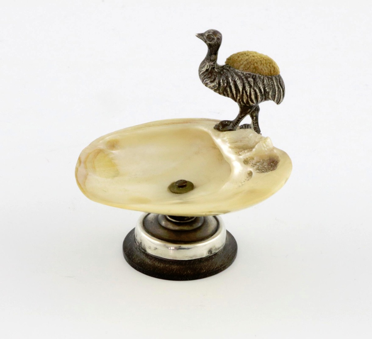 the silver-mounted shell dish applied with a small standing emu, on a raised silver-mounted wooden base, height 7.3cm.