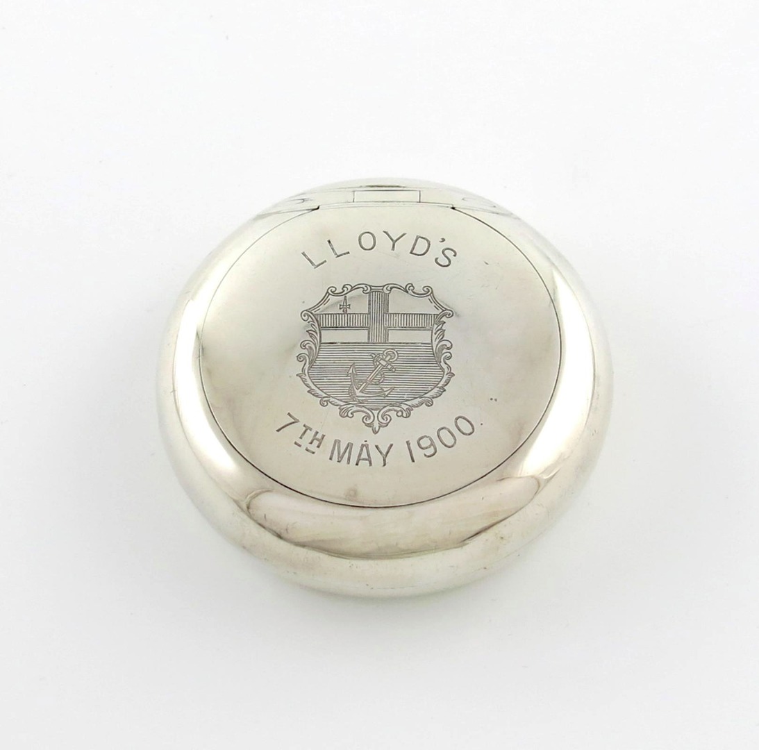 circular form, the flush hinged cover engraved with the arms of Lloyd's of London and inscribed '7th May 1900', diameter 7.3cm, approx. weight 2.2oz.