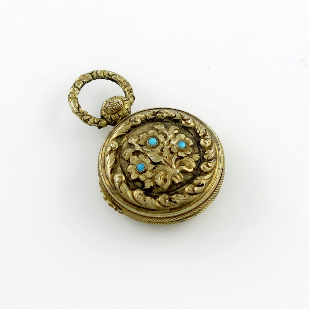 circular form, the front with three flowers with turquoise cabochons, foliate border, engine-turned base, the interior with a pierced foliate scroll grille, diameter 3cm, approx. weight 0.5oz.