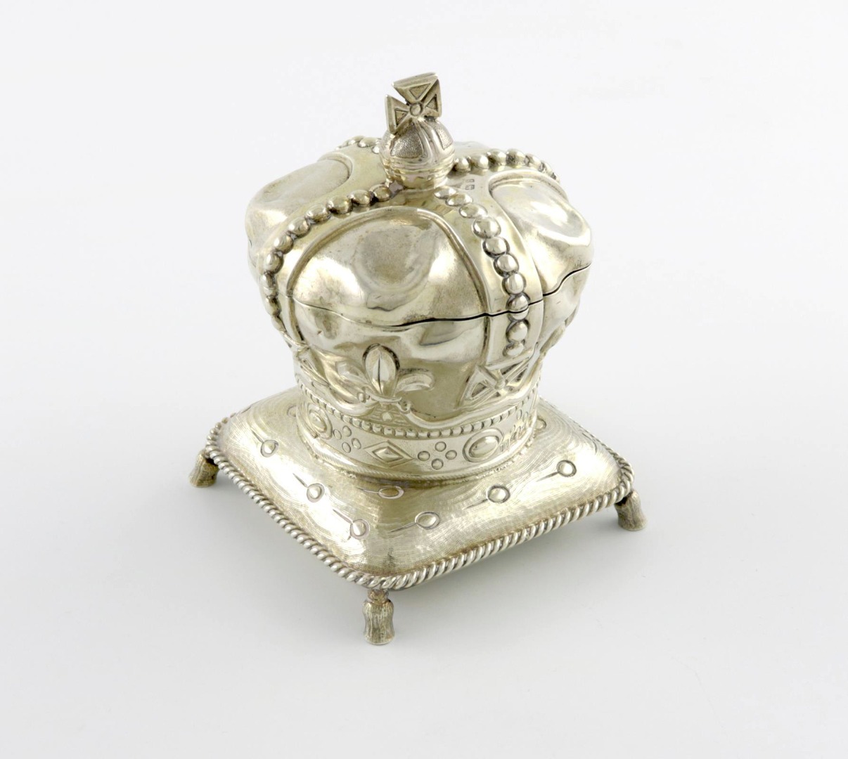 modelled as the Royal crown, on a cushion, hinged cover, the interior gilded and with a liner, on four tassel feet, height 10.5cm, approx. weight 4.4oz.