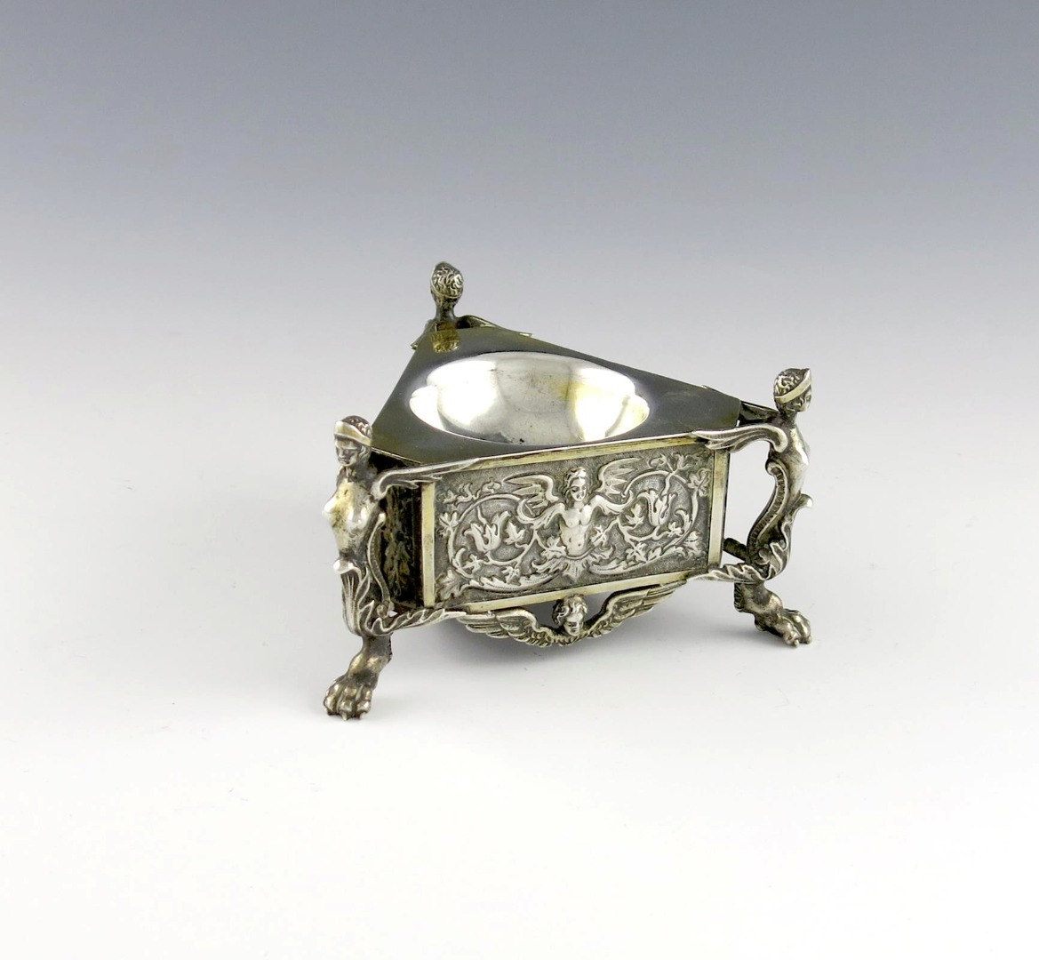 of triangular form, chased with figures and foliate decoration on a matted background, on three winged caryatid legs on paw feet, gilded bowl and traces of gilding to piece, length 10cm, approx. weight 6.7oz.