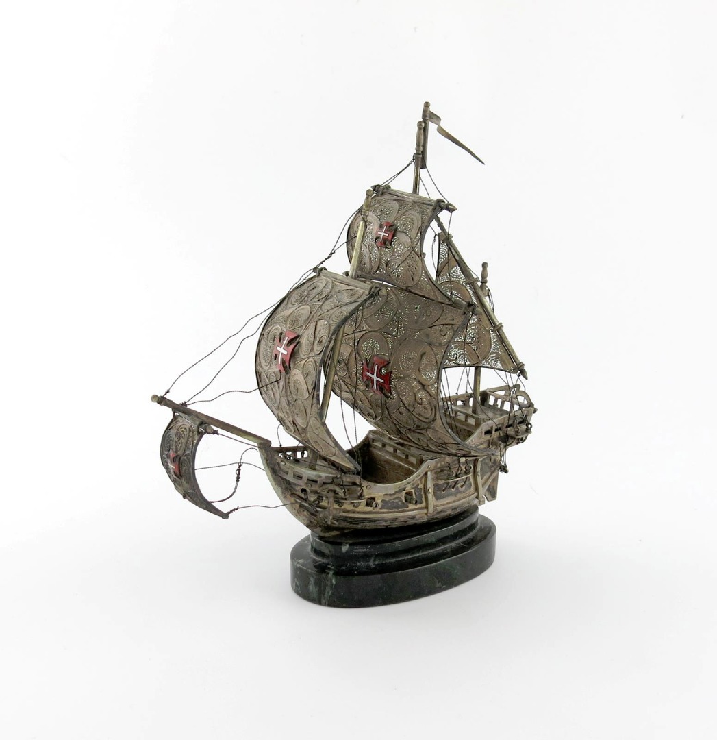 in full sale, with filigree sails mounted with red and white enamel crosses, on an oval marble plinth, height 22.8cm.