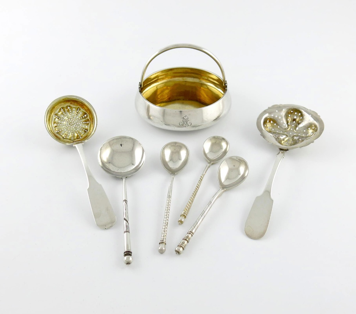 comprising: a swing-handled basket, of circular form, gilded bowl, assay maker Viktor Savinkov, Moscow 1884, initialled, plus a silver and niello spoon, the reverse of the bowl with a cathedral, plus two Russian sifting spoons and three teaspoons, approx. weight 12.8oz. (7)