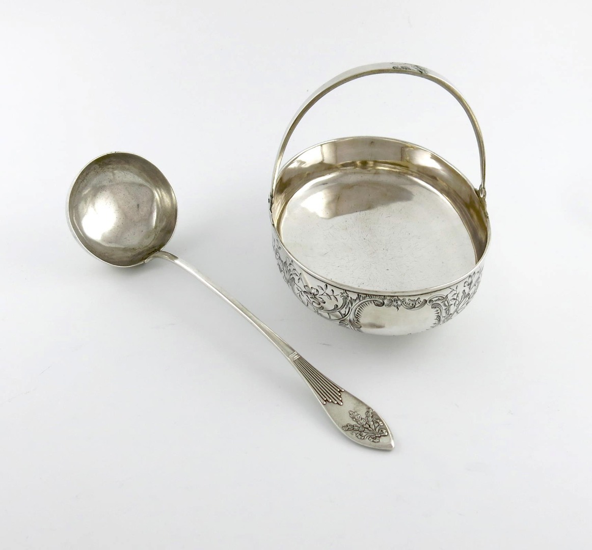 oval form, the swing-handle repaired, the body with engraved foliate decoration, on an oval foot, length 21.3cm, plus a Russian silver soup ladle the terminal with ribbon-tied decoration, approx. total weight 21oz. (2)
