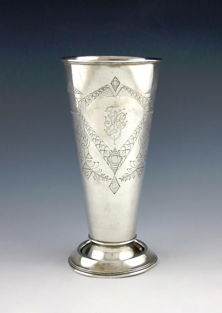tapering circular form, engraved foliate decoration, with a monogram, on a raised circular foot, height 21cm, approx. weight 9.7oz.