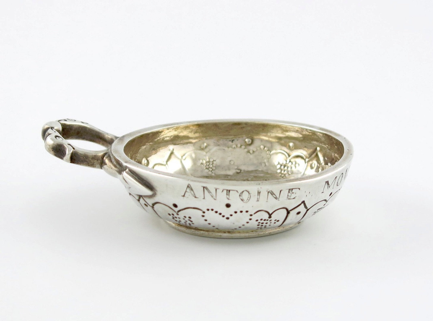circular form, double snake ring handle, fluted decoration and punch bead grape decoration, engraved 'ANTOINE MOVSERON, 1776', length 9.9cm, approx. weight 3.2oz.